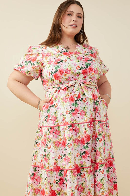 Contrast Tiered Belted Floral Print Dress *Floral Print Fabric *Tiered Skirt *Belted Waist