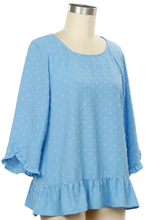 Add a pop of color to your wardrobe with our Bright Blue 3/4 Sleeve Dotty Top. Made from 100% polyester, this stylish top features a solid bright blue hue and a playful dotted design. Its 3/4 sleeves offer a flattering and comfortable fit, making it perfect for both casual outings and more dressed-up occasions. Available in sizes S to 3X, it's versatile and easy to pair with your favorite jeans or skirts for a fresh, stylish look.