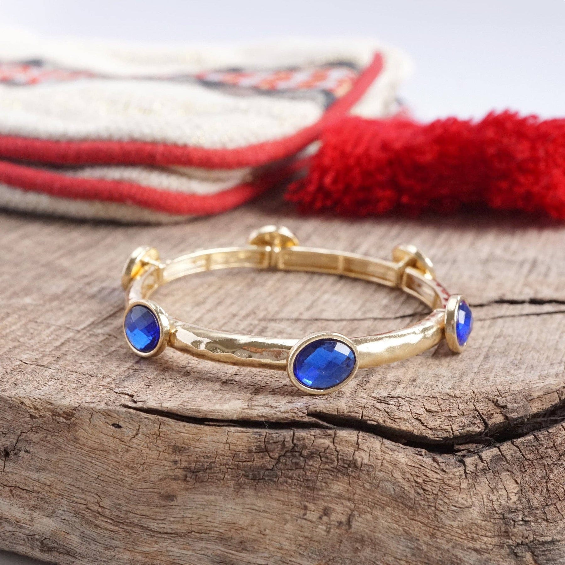 Jeweled Golden Bangle - with Faceted glass oval colorful jewels Hammered Shiny gold tone stretchy bangle Faceted glass jewels in - Blue, Green, Red, Multi Stretchy - one size fits most Check out the other - Jeweled Bangle items we have
